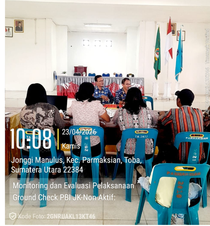 Camat Parmaksian memberi arahan dan sambutan pada kegiatan Monitoring dan Evaluasi Pelaksanaan Ground Check PBI JK-Non Aktif Tahap I (109 kk). Kegiatan ini dihadiri oleh Kepala Dinas Sosial yang diwakilkan oleh Kabid Perlindungan dan Jaminan Sosial Bapak Moses Simanjuntak, ST.MM pada hari Kamis, 23 April 2026