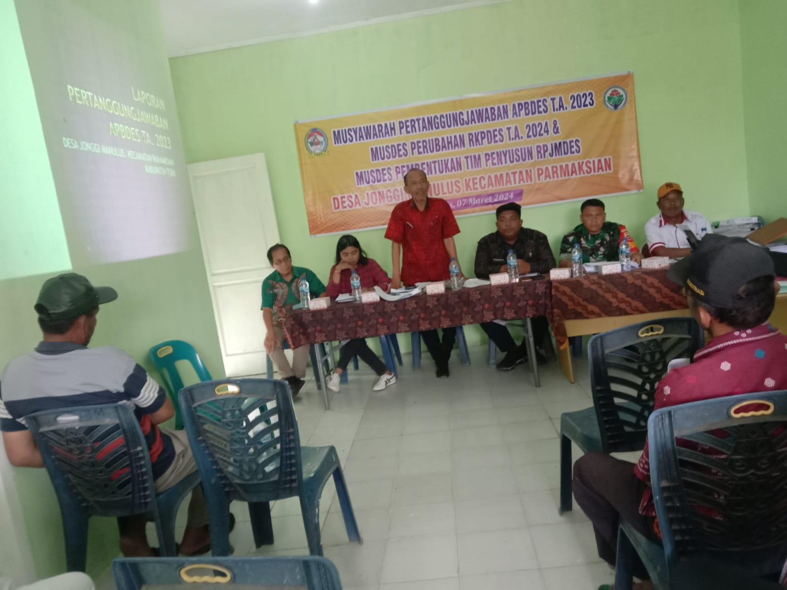 Camat Parmaksian yang diwakilkan oleh Kepala Seksi Tapem menghadiri Musyawarah Desa Pertanggungjawaban TA 2023 Desa Jonggi Manolus pada hari Kamis, 08 Maret 2024.