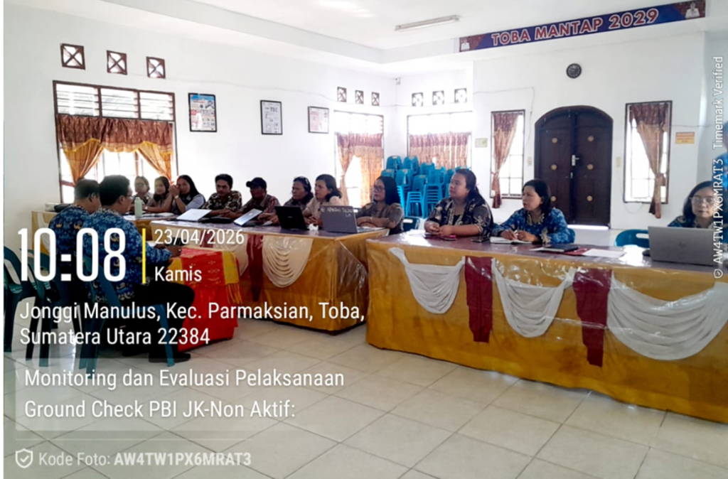 Camat Parmaksian memberi arahan dan sambutan pada kegiatan Monitoring dan Evaluasi Pelaksanaan Ground Check PBI JK-Non Aktif Tahap I (109 kk). Kegiatan ini dihadiri oleh Kepala Dinas Sosial yang diwakilkan oleh Kabid Perlindungan dan Jaminan Sosial Bapak Moses Simanjuntak, ST.MM pada hari Kamis, 23 April 2026